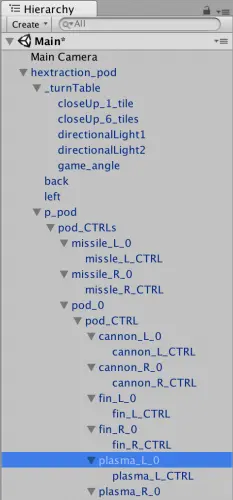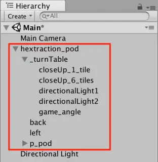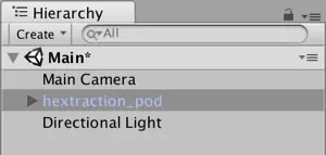 GameObjects也可以充当容器。 按住Alt键并单击Hierarchy中hextraction_pod左侧的disclosure triangle。 这将扩展GameObject及其下的所有级别。 您将看到以下GameObjects集合: