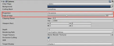 在层次结构中选择Main Camera,你会在Inspector中看到一个Camera组件。 这里有很多选项,但现在忽略除投影(Projection)和视野(Field of View)之外的所有内容: