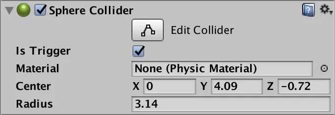 在Hierarchy结构中选择了Spaceship后,在Inspector中找到您的Sphere Collider。 将Center设置为X = 0,Y = 4.09,Z = -0.72,然后将Radius设置为3.14。 最后,选中Is Trigger复选框。 Kinematic GameObjects无法注册正常碰撞,但它们可以侦听来自其他Kinematic对象的触发事件。