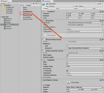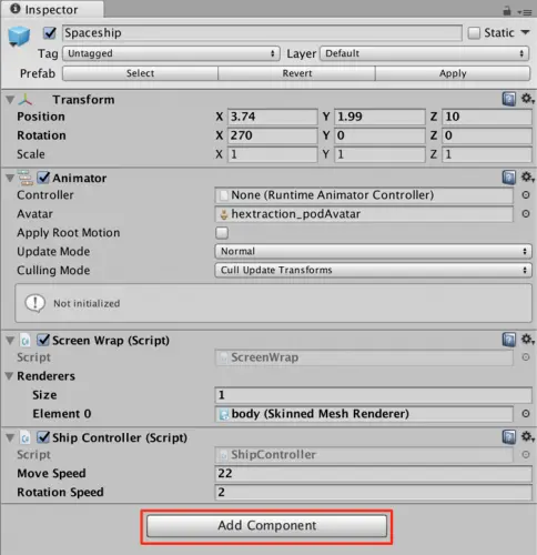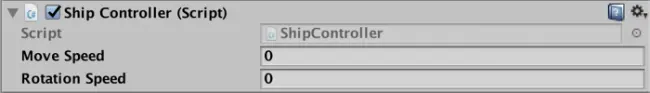 您现在应该看到Ship Controller脚本已作为Script组件添加到Inspector窗口中的Spaceship GameObject。