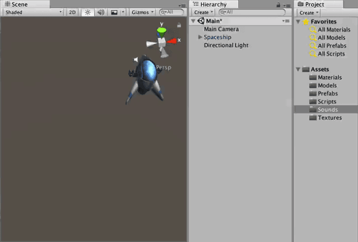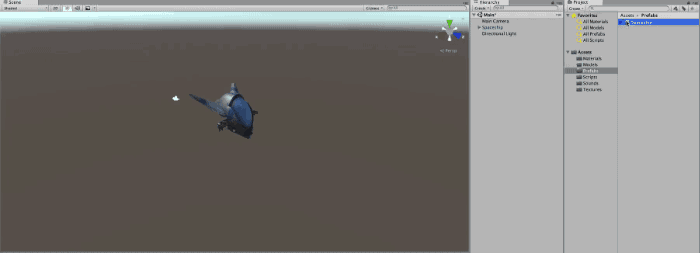将GameObject拖动到Project窗口会将其转换为prefab,而无需您做任何额外的努力。 您可以通过将它们从Project window拖动到Scene view中来创建任意数量的Spaceship实例。 目前,这仅复制模型,但稍后它可能包含脚本,音频设置等等。 所以你已经可以看到,Prefabs真的很有帮助。