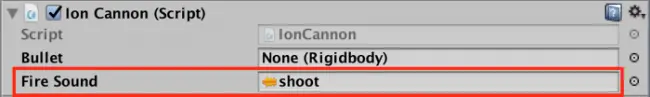 将射击声音从Project window中的Sounds文件夹拖动到Fire Sound的Field中:
