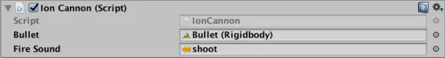 在Hierarchy中选择Spaceship,打开Assets / Scripts文件夹,然后将IonCannon脚本从Project窗口拖到Inspector窗口: