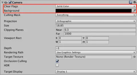 在层次结构(Hierarchy)中选择主摄像头(Main Camera),然后使用Inspector将Clear Flags设置为Solid Color和Background Color为black: