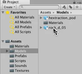 最后,花点时间保持Project窗口的有序:单击Assets文件夹以显示其内容。 然后将hextraction_pod拖到Models文件夹中,将p_pod_文件拖到Textures文件夹中。
