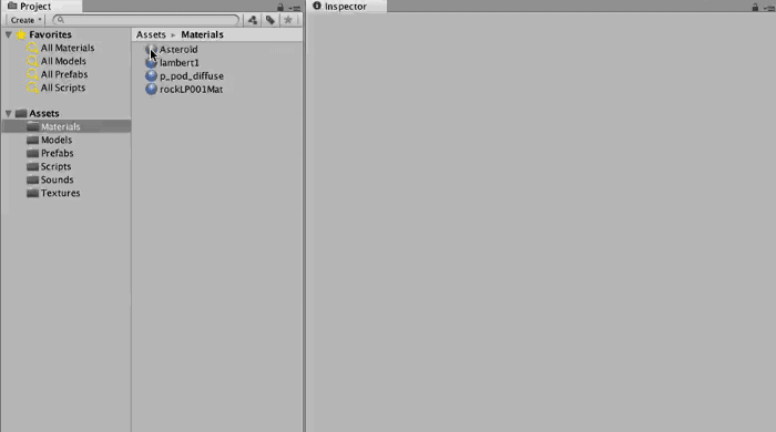 在Project窗口中打开Materials文件夹,然后单击Create按钮。从下拉列表中选择Material并将其命名为Asteroid。在Inspector窗口中,您现在将看到material的可用属性。