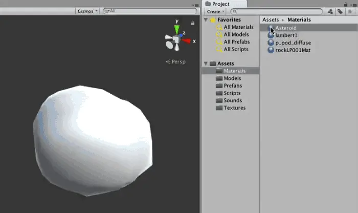 使用所有配置的材料,您现在需要将其添加到小行星。 将“小行星”(Asteroid)材质从Project窗口拖动到“场景”视图(Scene view)中的“小行星游戏对象”(Asteroid GameObject):