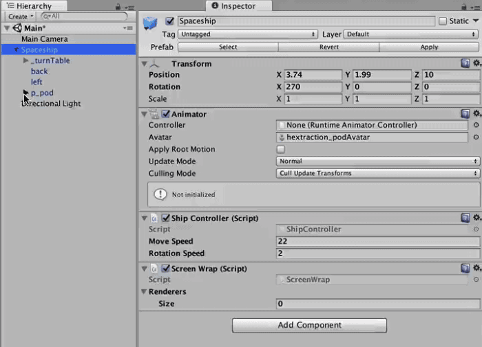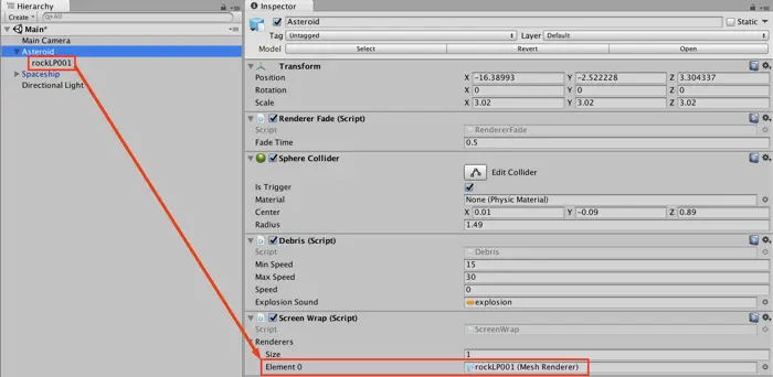 Asteroid有一个名为rockLP001的子GameObject。 将此子GameObject拖动到Asteroid GameObject的Inspector中的Screen Wrap Script组件的Renderers属性: