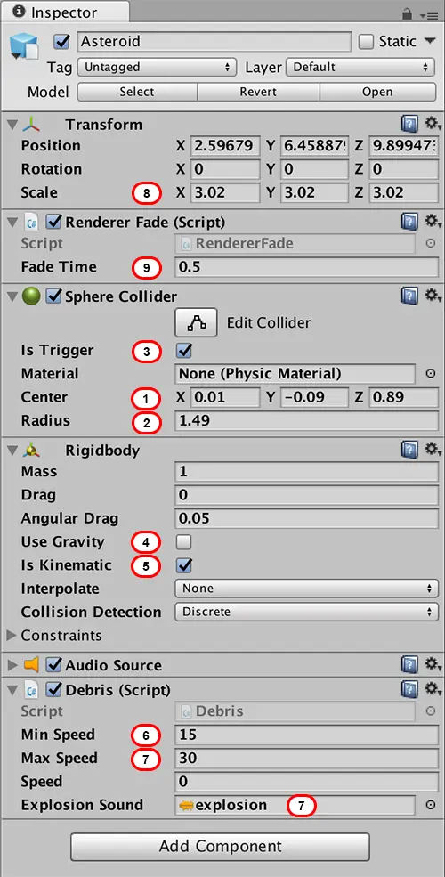 Debris script自动向小行星添加了Sphere Collider,Rigidbody和音频源(Audio Source)。 现在设置所有必需的属性: