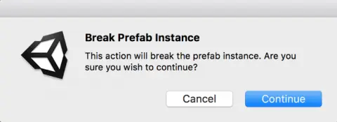 Unity警告你,这样一个重大变化将破坏与prefab的连接。 由于您确定要执行此操作,请单击Continue。 您会注意到hextraction_pod标有黑色文本,表示它已恢复为普通的旧GameObject: