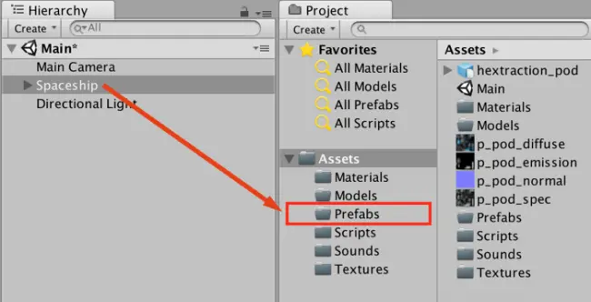 现在将Spaceship拖动到Project窗口的Prefabs文件夹中: