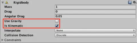勾选Is Kinematic复选框;由于您未在此游戏中使用重力,请取消选中Use Gravity复选框,如下所示: