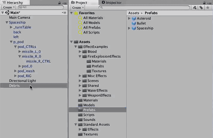 最后,将“小行星”(Asteroid)从“层次结构”(Hierarchy)拖动到Project窗口中的Prefab文件夹。 现在您已完成创建Asteroid Prefab,从层次结构中删除Asteroid实例。
