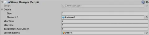 接下来仍然在GameManager上将Min Time设置为2,将Max Time设置为5。这告诉脚本它应该以多快的速度产生小行星。将Total Items on Screen设置为5,这将小行星的数量限制为5,这样玩家就不会被淹没。将碎片游戏对象(Debris GameObject)从Hierarchy拖动到Screen Debris field。这指定GameManager应该在Debris GameObject上产生小行星。
