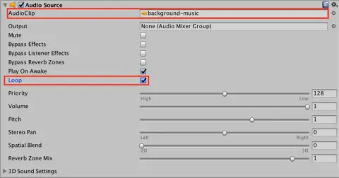 最后,在Audio Source组件中,将background-music添加到AudioClip字段,并确保选中loop复选框。