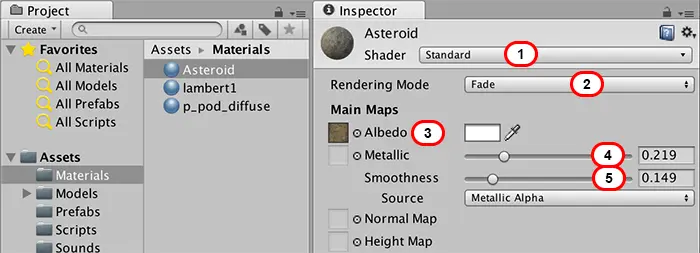 Shader选项允许您从众多预打包的着色器中选择一个。 默认的标准着色器具有极大的灵活性,因此请选择它。 - 2) 当一个小行星被击中时,你会想要淡出它,所以将