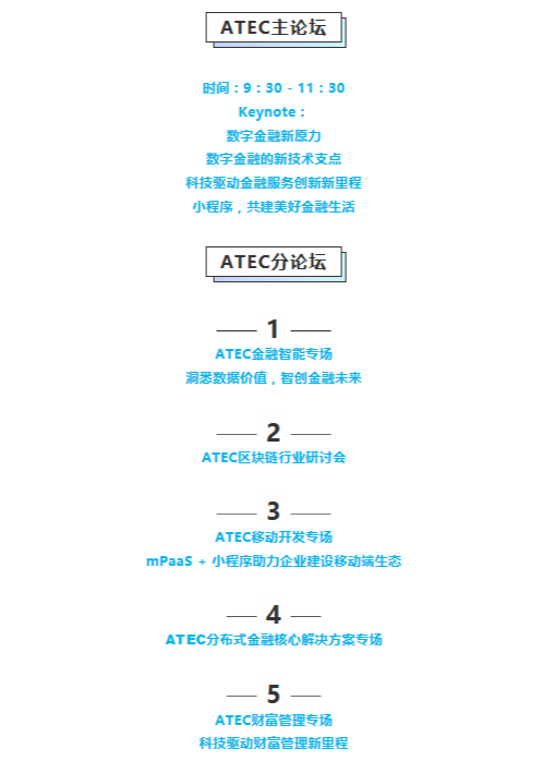 本次ATEC大会共包括一场主论坛和数字金融、区块链、金融智能、小程序/移动、财富管理五场分论坛。