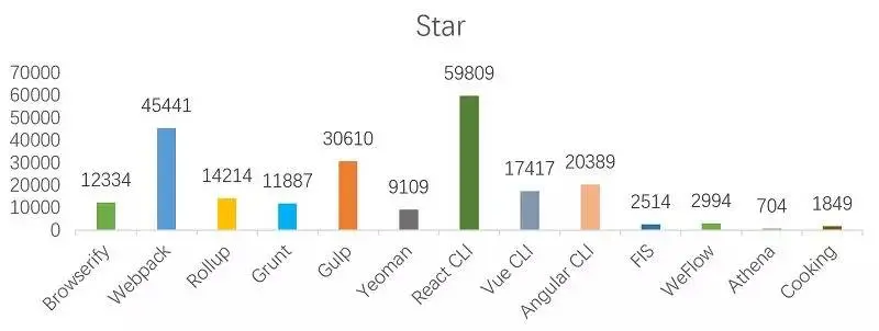 构建工具可以分为三类:模块化打包类、任务流构建类和集合型工具类(脚手架)。其中最为突出的,当属用于模块化打包的 Webpack和用于任务流构建的 Gulp。下面是截至2018年11月28日某时某刻, GitHub上各个工具的 Star数目(听说 Star数目可以造假?好生无聊的家伙们!)。