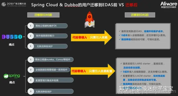 新版本增强了对主流微服务框架的原生支持,用户只需添加依赖和修改配置,即可获取企业级的微服务应用托管、微服务治理、监控报警和应用诊断等能力,实现代码零入侵。以主流微服务框架Dubbo和Spring Cloud为例,迁移至EDAS前,需要独立搭建和维护ZooKeeper、Eureka或Consul等组件,同时缺少保障应用稳定运行的链路追踪和限流降级功能,需要投入资源进行深度开发。迁入EDAS后,可0成本接入链路追踪和限流降级功能,并实现可视化,降低硬件投入和运维成本。