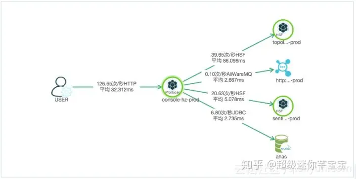 下图为一台阿里云ECS部署了微服务应用安装AHAS探针之后的可视化三层架构界面: