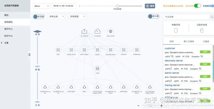 架构可视化不是目的,只是实现系统高可用性的手段。借助架构感知采集到的架构数据,在识别了用户使用的组件(我们对MySQL、Redis、MQ等的统称)后,我们借助这些组件以及与组件匹配的故障库,可以给用户自动推荐这些组件可能遇到的故障,配合我们提供的评测服务让用户更方便地对组件进行各种故障的模拟与演练,以提高系统的健壮性。其次,通过架构感知识别Java Application 应用,如果发现其负载较高,配合我们提供的限流降级(阿里巴巴开源的Sentinel商业版)功能,为服务的持续可用性保驾护航。