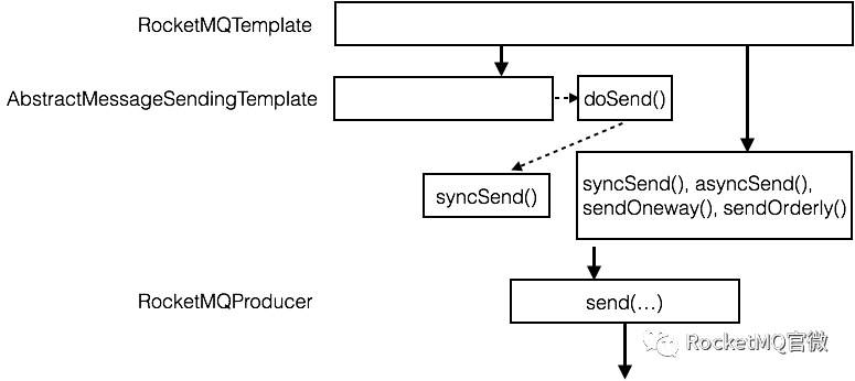 为了与Spring Messaging的发送模板兼容,在RocketMQTemplate集成了AbstractMessageSendingTemplate抽象类,来支持相关的消息转换和发送方法,这些方法最终会代理给doSend()方法;doSend()以及RocoketMQ所特有的一些方法如异步,单向和顺序等方法直接添加到RoketMQTempalte中,这些方法直接代理调用到RocketMQ的Producer API来进行消息的发送。