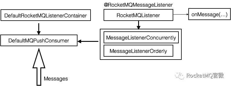 在消费端Spring-Boot应用启动后,会扫描所有包含@RocketMQMessageListener注解的类(这些类需要集成RocketMQListener接口,并实现onMessage()方法),这个Listener会一对一的被放置到DefaultRocketMQListenerContainer容器对象中,容器对象会根据消费的方式(并发或顺序),将RocketMQListener封装到具体的RocketMQ内部的并发或者顺序接口实现。在容器中创建RocketMQ Consumer对象,启动并监听定制的Topic消息,如果有消费消息,则回调到Listener的onMessage()方法。