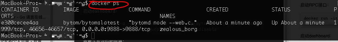docker run -it -p 9888:9888 -v ~/Library/Bytom:/root/.bytom bytom/bytom:latest