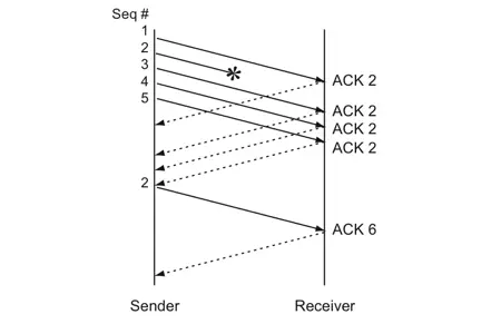 2种方案有好有坏,第一种比较慢,第二种浪费带宽,所以tcp引入了一种快速超时重试机制(Fast Retransmit算法),不以时间计算,而以数据做驱动重新传送,如果包没有连续到达,比如1到了,2没到,3,4,5也到了,这个时候,B始终返回ACK=2,代表只确认1,然后A就知道2没到,重新发2,但是B一旦收到2会直接ACK=6给A,这个的意思就是说2拿到后,345也收到了,直接给6就ok,如下图:
