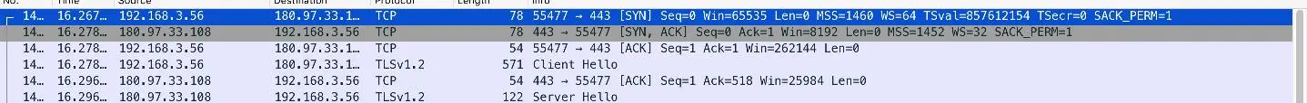 A:B,你好,我是A 请求建立连接,我的seq是0,我的win是65535,我希望本次回应我的内容长度len为0,我本次能接收的最大内容是1460,over; B:A,你也好,收到你的信息了,我是B,我本次的seq是0(注意,双方的序号是独立计算的,这里都从0开始的),我回应你的ack是1(A的seq+1,代表我收到你seq是0的消息了),我的窗口大小是8192,我希望你回应我本次消息的len也是0,我这边能接收的最大回应大小是1452,over; A:好的,我收到你的回应了,我现在给你发送的seq是1(上一次是0,这次是1),我回应你的ack是1(B的seq+1),我当前的窗口大小是25984,我希望的回应长度是0;我们建立好连接了,over;