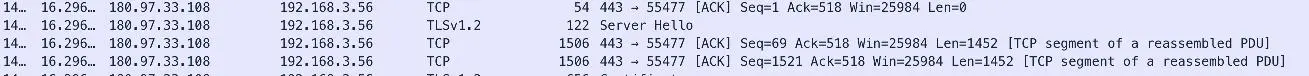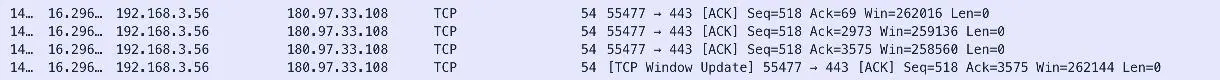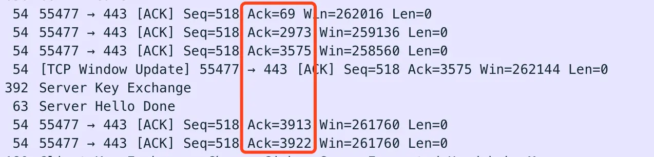 可以看到A向B连续发了3条数据,但是回应B的ACK没有变,也就是说都是回应同一个B的同一个响应,但是A自己的seq更新了3次,先是1,然后是69最后是1521,说明这三个包是连续发出去的,实际上只要当前数据包的大小不超过对方的window大小,就可以连续发的,接着看: