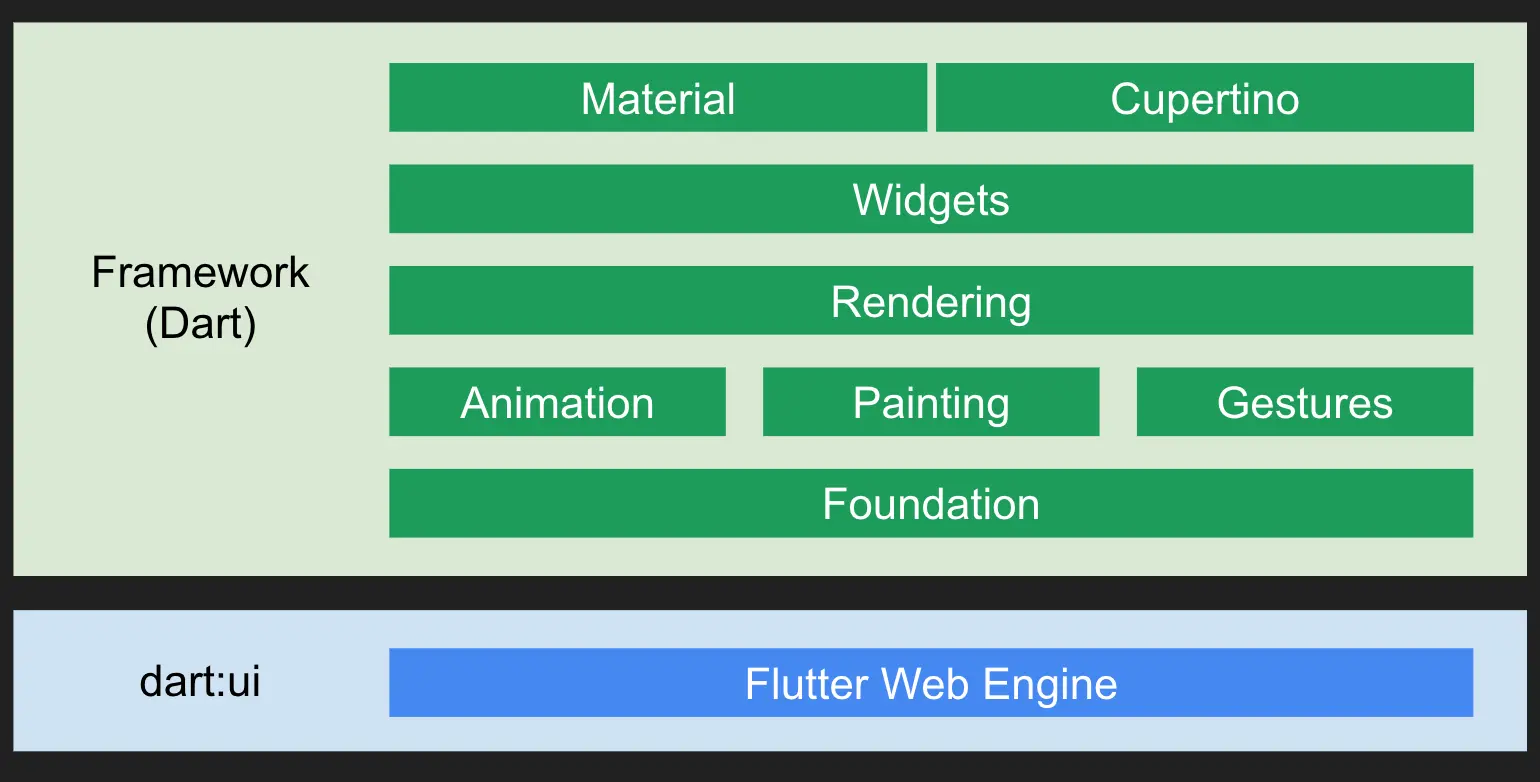 dart:ui之上的层级就是我们所谓的“框架”层。它下面的层级我们称之为“引擎”。该框架完全使用Dart编程语言编写。大多数引擎都是用C ++编写的,特定于Android的部分用Java编写,而iOS特定的部分用Objective-C编写。 dart:ui中的一些基本类和函数是用Dart编写的,主要用作Dart和C ++之间的桥梁。