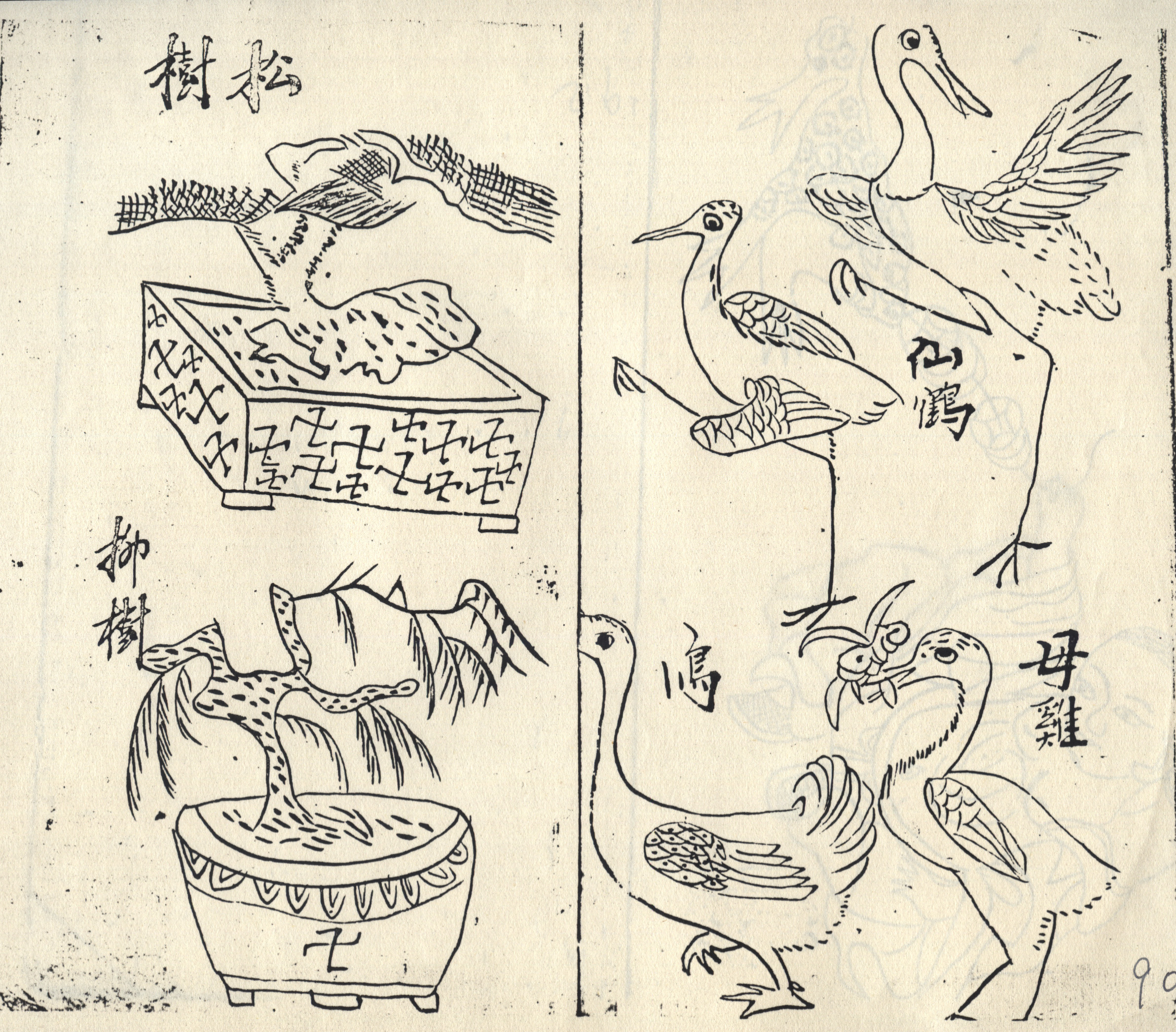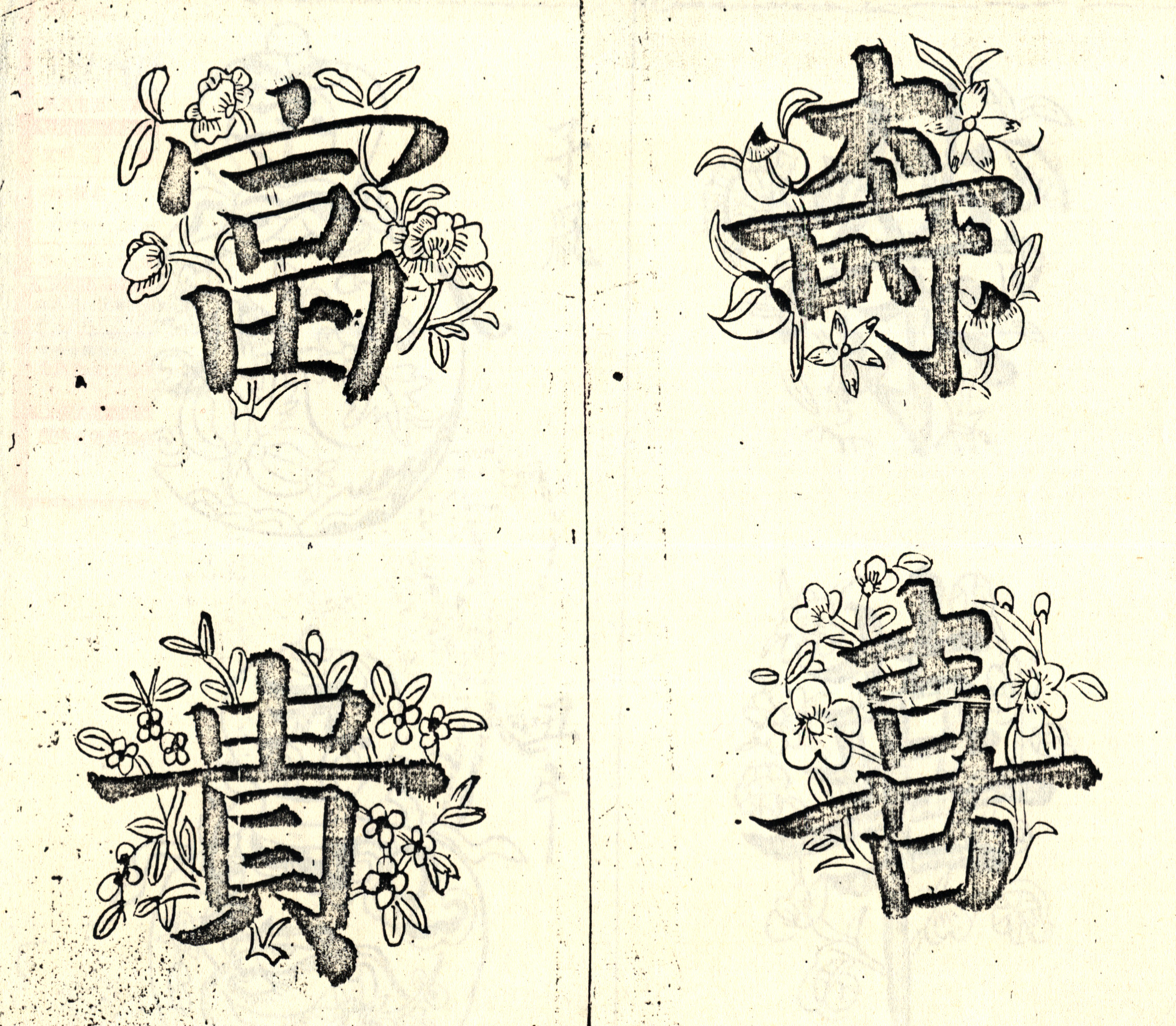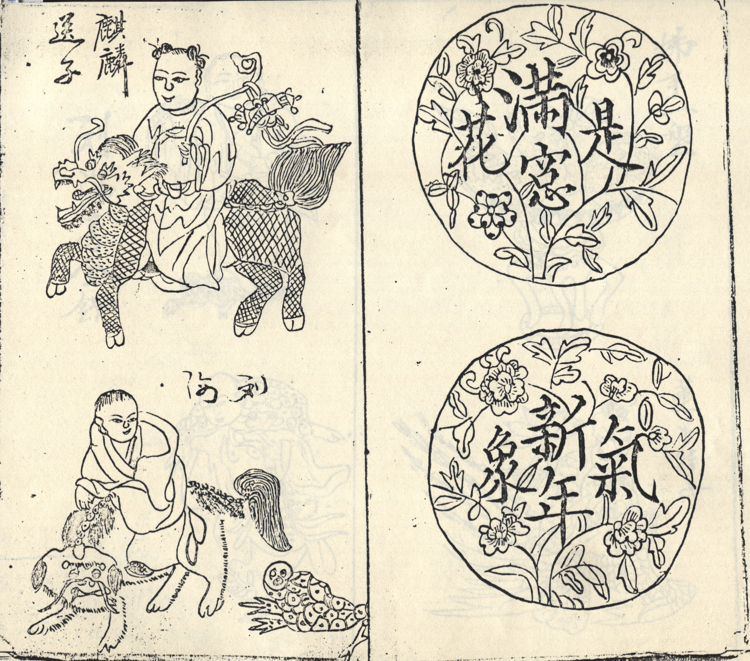 除了《松筠清画》一书外,还有另一本毛唐氏(90多岁)外祖母的剪纸样本,共92页。内容有书体图案福禄寿喜、富贵荣华,满窗是花,新年气象,葫芦形十二生肖图,史千(时迁)偷鸡,百禄是荷,排云谱(千祥云集、五云迎日、云驾六龙、驾云腾空、五色祥云、实应太平、瑞气千里、一片祥光),站八仙,云上八仙,骑兽八仙,共乐太平,连中三元,独占鳌头,蟾宫折桂,三娘教子,送灯,知府赏农,牧童,种地,采桑,五子登科,耍孩子,打鱼,捕虾,八角鹿,六合同春,刘海戏金钱,天宫,寿星,长生不老,耍货郎鼓,耍别天(蝙蝠),麒麟送子,莲笙桂子,青龙,白虎,果盒,盆景等。此本线条粗放活泼,更具有民间风味。从以上两本剪纸稿样中除了能够做为鉴定胶东古老剪纸的范本外,还可以从中了解到清代人民的文化状况和审美情趣,以及当时当地剪纸的时代风格;同时又从剪纸样本中看出当时文人也参与剪纸稿样的创作,据说清代掖县(今莱州)画家张士保,曾给他妻子画过《八仙》《放爆竹》《四君子》等窗花稿样,他的学生刘鸿宾也曾整理修改过剪纸《老鼠娶亲》。民间剪纸受到文人画的影响,风格越发细致,以致能在乡镇市井中广泛流传,影响山东剪纸的风格,或者说是增加了山东民间剪纸的样式,使山东部分民间剪纸达到了雅俗共赏的程度。