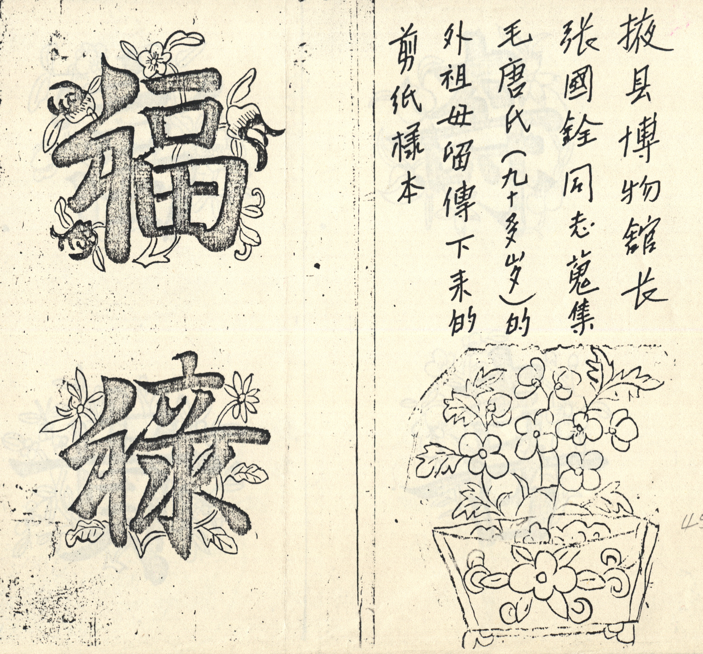 掖县(现莱州市)张国铨先生是我省著名剪纸艺术家,他收藏当地的民间剪纸也颇丰,原在县文化馆工作,后调市博物馆任馆长,是我的老朋友。他于20世纪六十年代在乡间搜集到两本清代剪纸墨线画稿,非常宝贵。