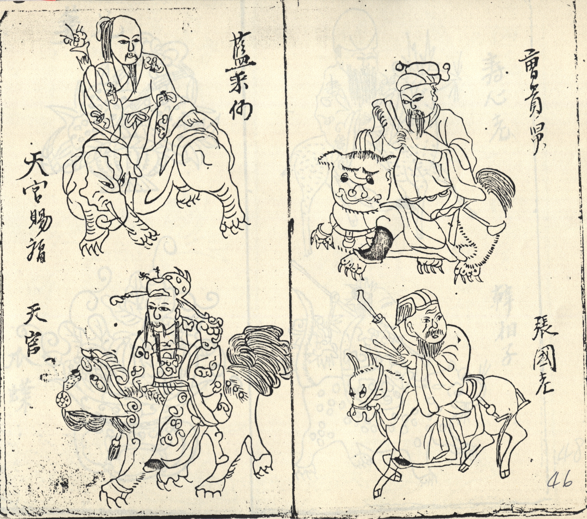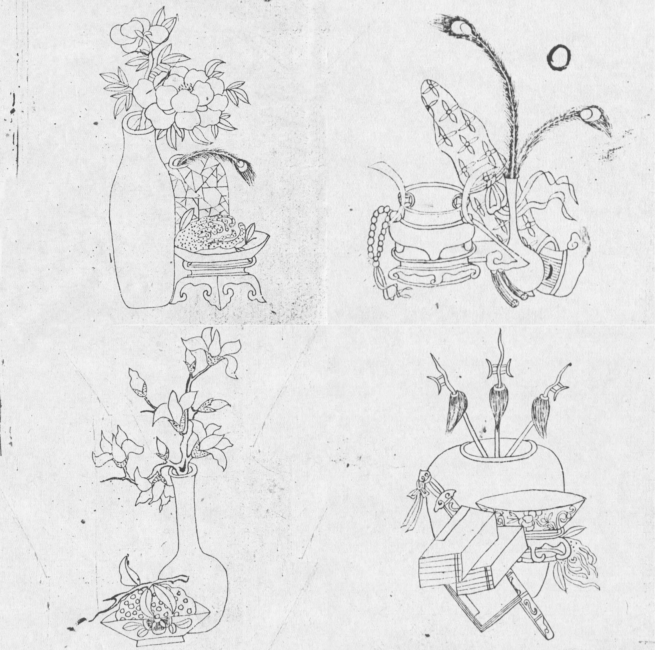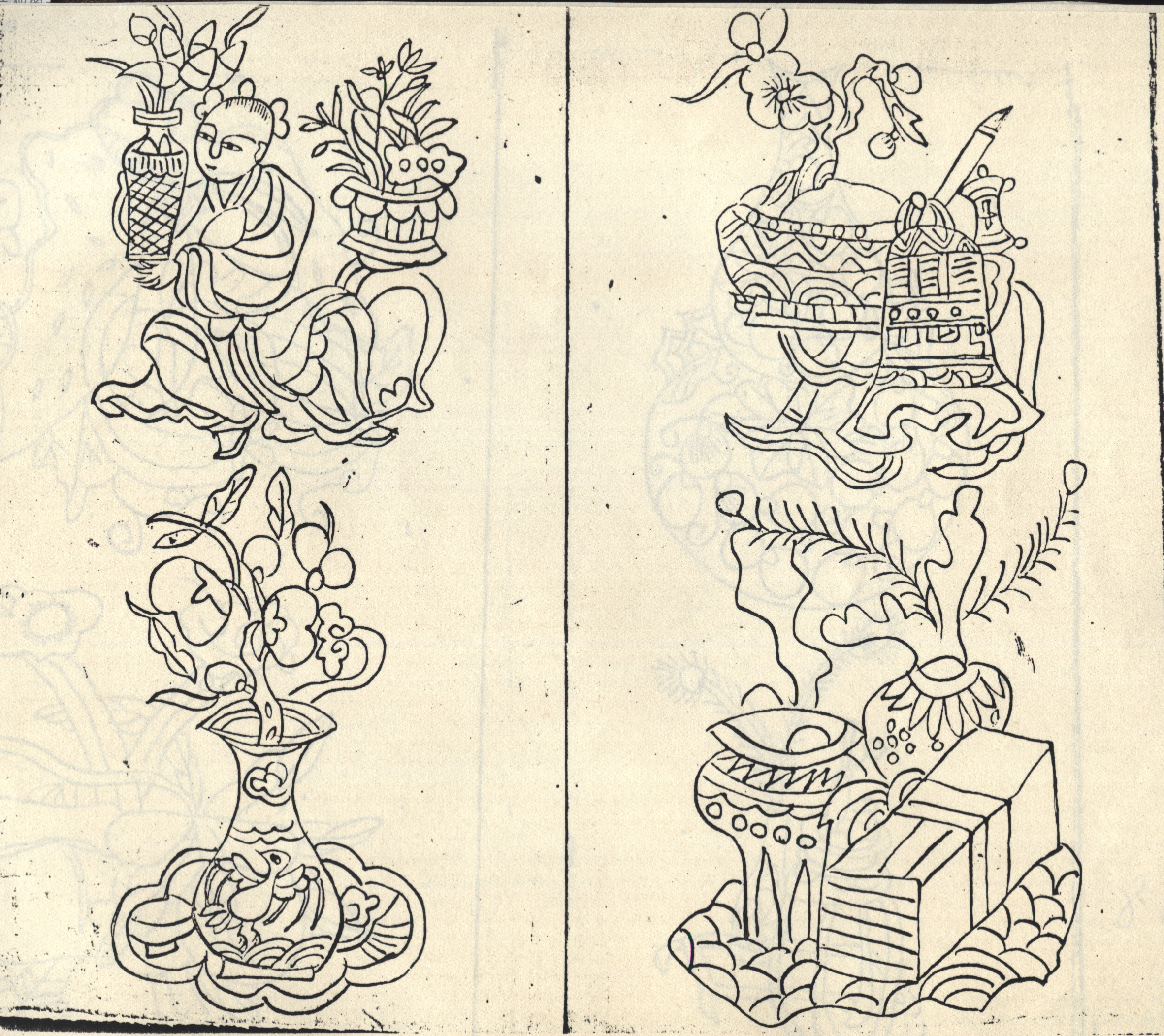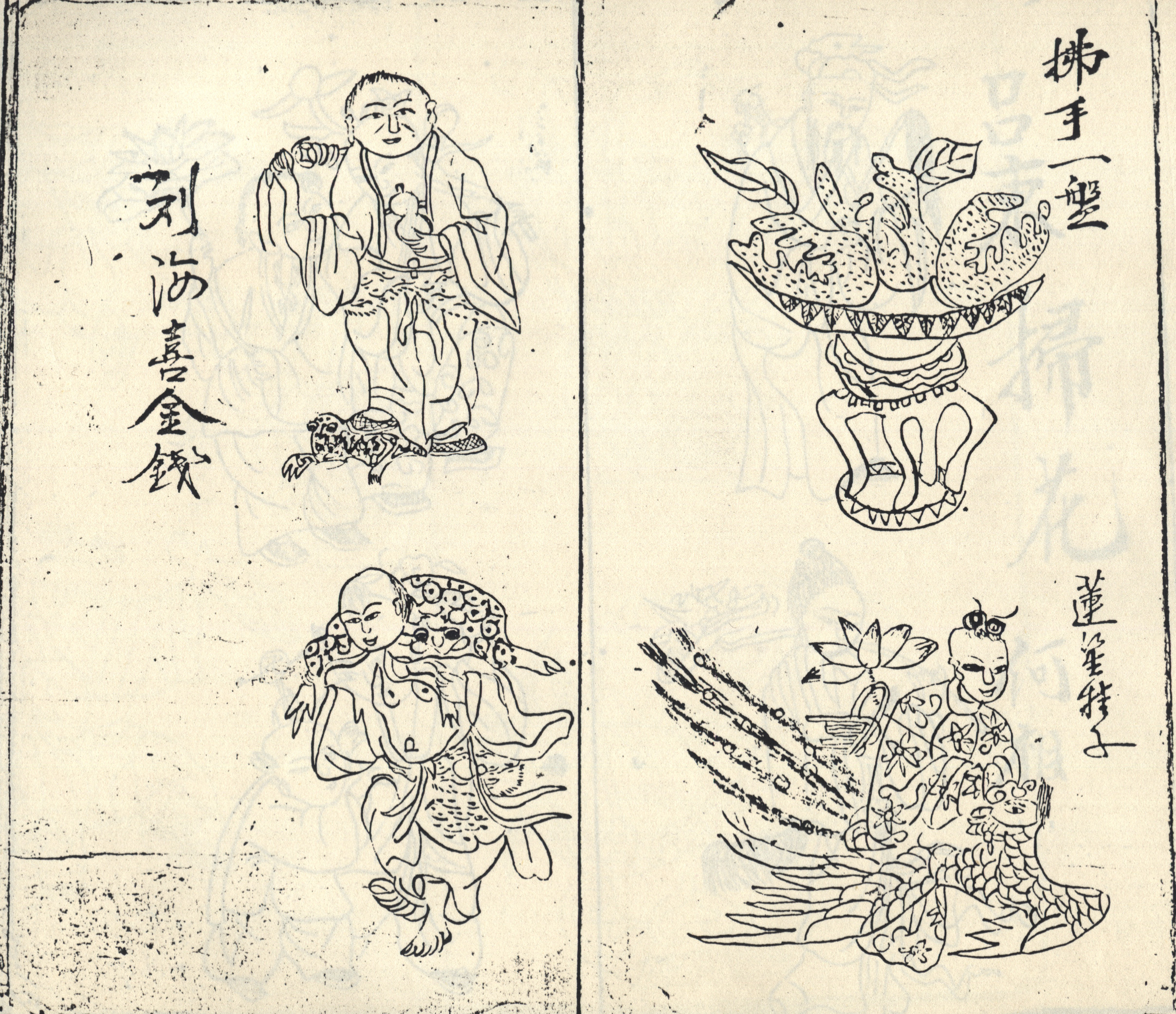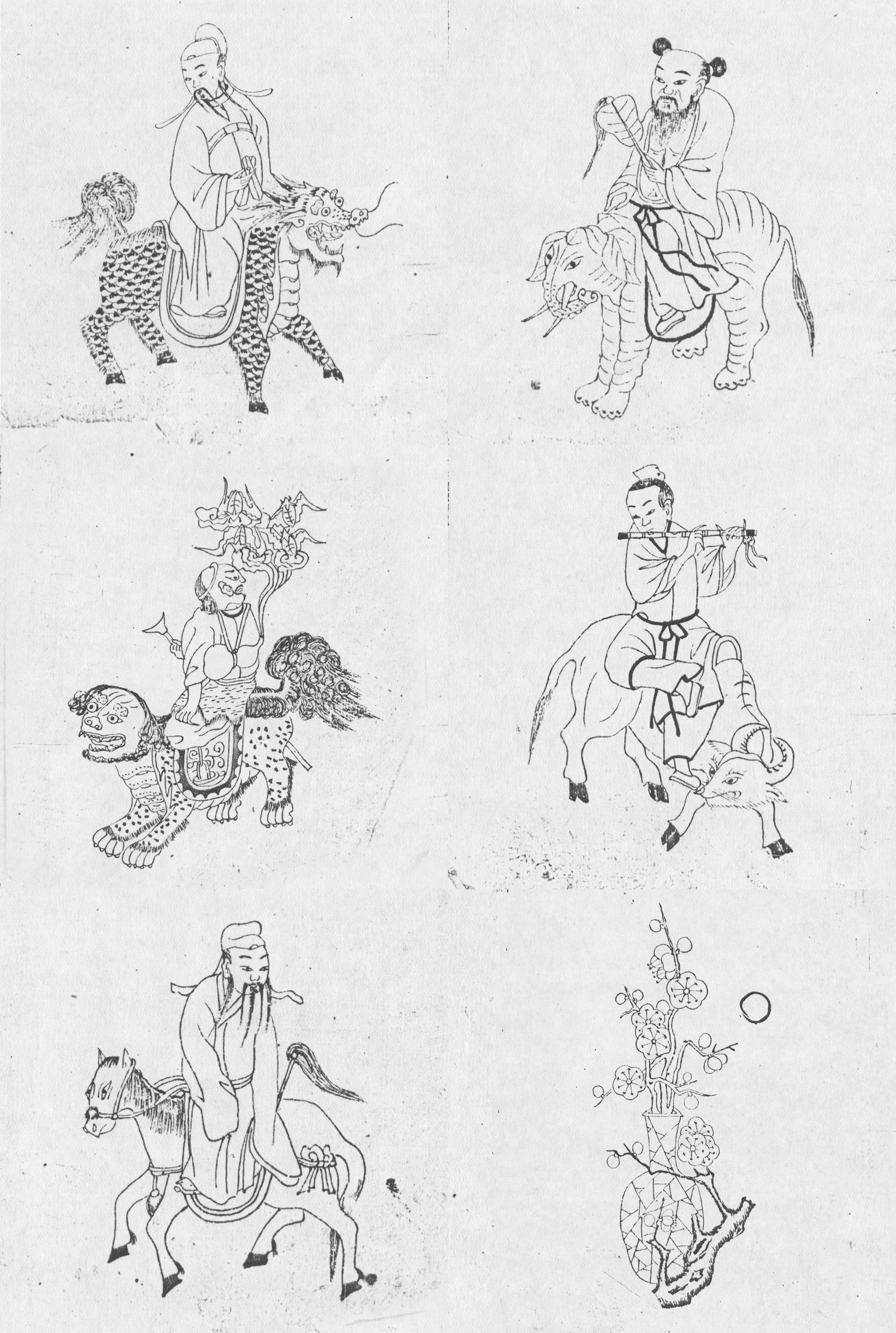 其中一本封面写有“光绪十八年(公元1893年)松筠人物清画”共108页(有残缺)。内容有罗汉、四妃十六子、上八仙、福禄寿喜、招财进宝、青蛇白蛇、虾兵蟹将、排云谱、昭妃出塞、唐僧取经、车马夫、送灯等不止是人物,还有琴棋书画、八宝、清供、花篮以及其他动物花卉等。这本勾线匀细而有功力,值得欣喜和重视的是有的和我们搜集到的胶东剪纸对照相符合。为我们鉴定胶东古老剪纸有了参照的标准。