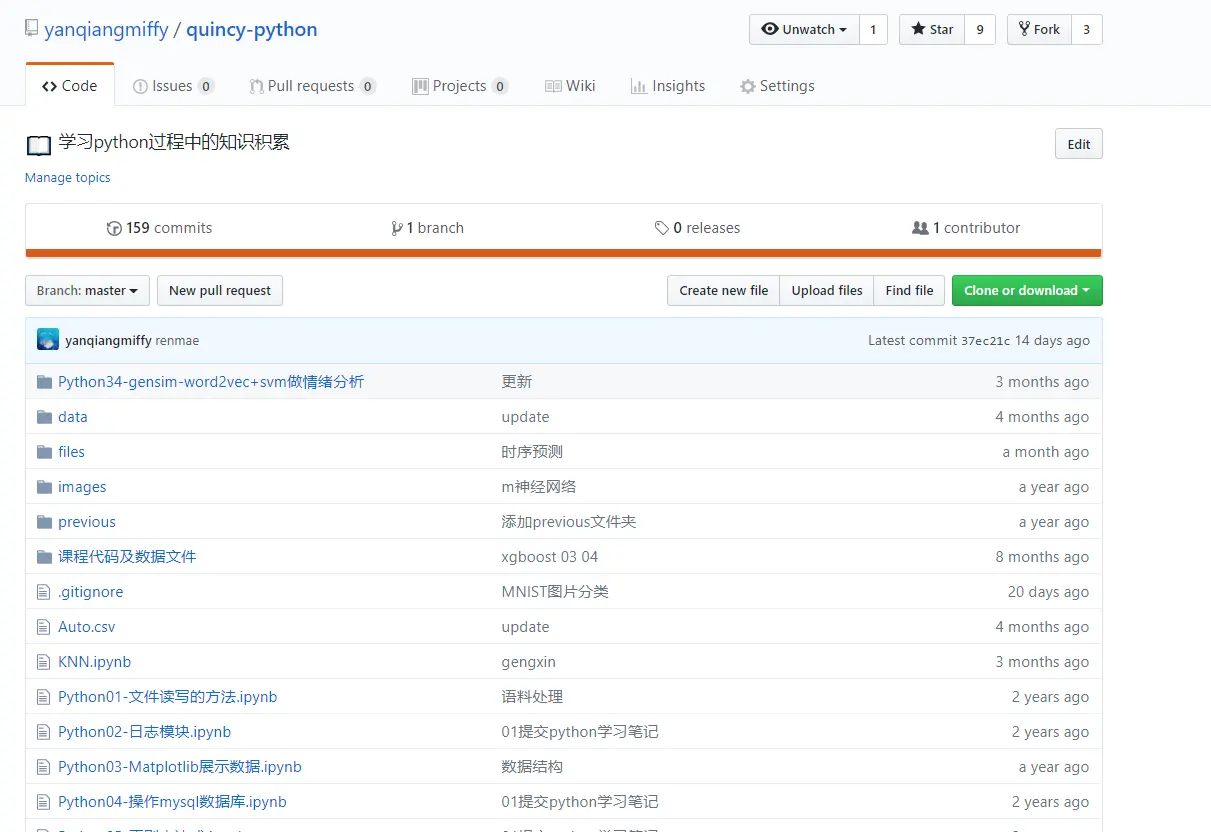 其中有一个项目是自己坚持最久的,基本上是自己学习Python的历程,在解决问题的过程中,用到什么,就去查什么,一共差不多有100个notebook。quincy-python