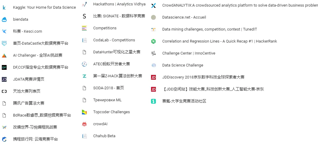 空闲的时候,自己和同学在一些比赛网站(比如天池、DataCastle、DF,Kaggle)找一些比赛做。和大佬们有差距甚大,基本上在二梯度徘徊,一是入门晚,二是大佬们确实下了功夫,在框架基本成熟已知的情况下,拼的是特征工程,印象最深的一个就是在神策杯中,前排大佬做了个100个特征,考验的不仅是技术还有耐心吧。下面是我整理的网站,我基本上找一些关于NLP的,同时积累下数据集。欣慰的是上个月确认收货数学建模三等奖。