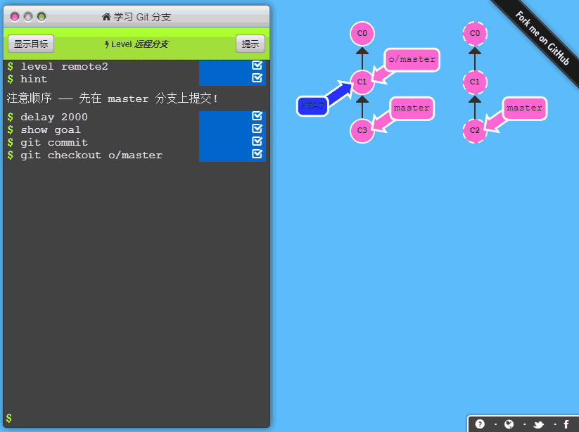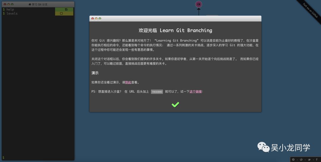 我想每个程序员都有 GitHub 吧,想我工作一年才知晓这个宝藏,我也慢慢地从“拿来”到自己造轮子,16 年,我前后开源了几个库,目前这些项目被 Stars 3400+,我也拥有 Followers 1k+。在使用 GitHub 过程中,当你想向 GitHub 上传代码时,肯定会涉及 Git,我因此自学了相关知识。如果你想学习 Git,正好看到这篇文章,那你赚到了,因为今天我要分享一个很好玩的东西给你,用玩游戏的方式来学 Git,当然你如果会 Git,也可以来玩玩,打开网站:https://learngitbranching.js.org