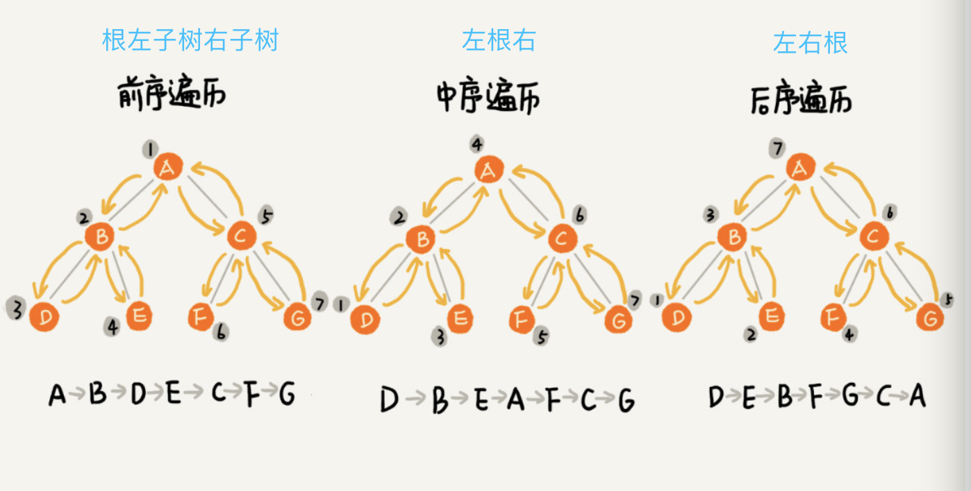 三种方法:前序遍历、中序遍历、后序遍历(前中后指的是根节点的位置)。遍历是一个递归的过程。