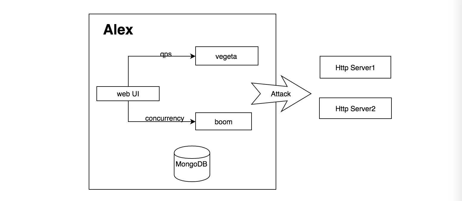 如果你觉得命令行下使用 Vegeta 比较复杂的话,你还可以使用 Alex 项目。Alex 是一个基于 Vegeta Library 和 Boom 封装的压力测试 Web UI,Vegeta 提供稳定的 QPS 压力源,Boom 提供稳定的并发数压力源。