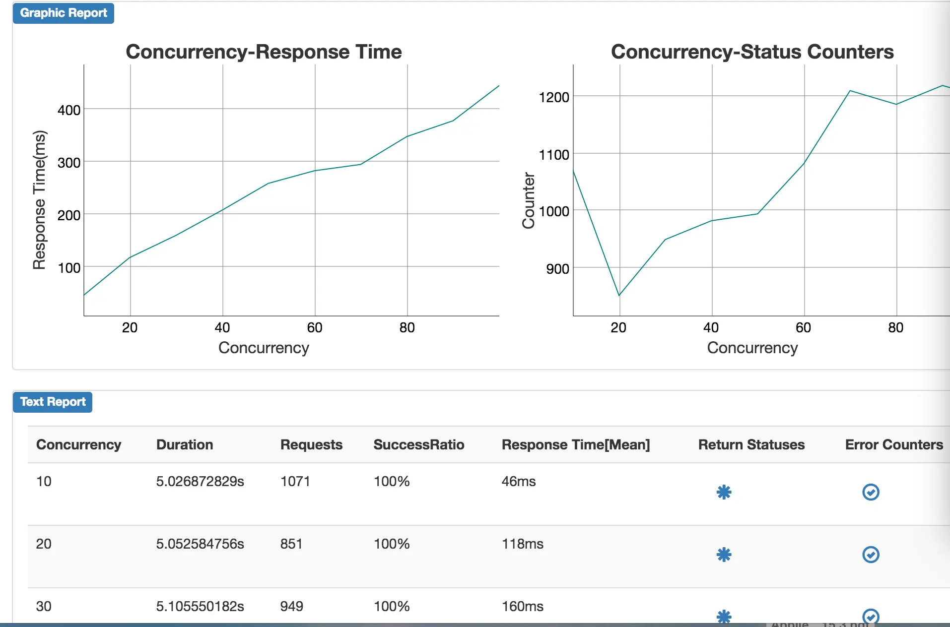 最后我们可以通过 vegeta report 命令生成此次压测的报表。vegeta report 命令可一次性读取使用逗号分隔的多个结果文件并生成报告,默认通过时间戳进行排序。
