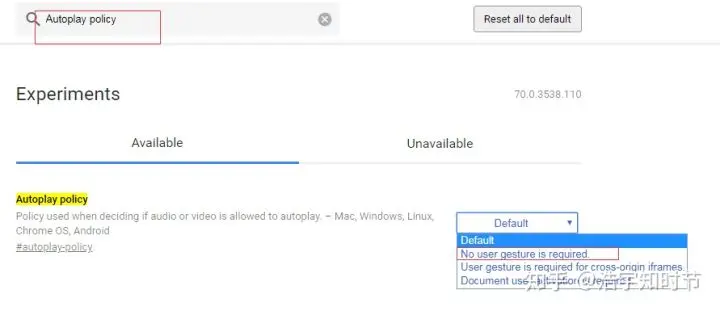 audio标签在chrome中autoplay属性无效解决办法 好雨知时节t 2018-12-05 2,580 阅读1分钟 在chrome地址栏中输入chrome://flags/ 再搜索Autoplay policy 再在右侧的选项中设置为 No user gesture is required 即可