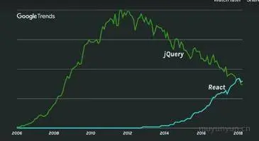 今年的 React Conf 的一张图, 可以看到 React 从出来到现在势头呈稳健上升趋势, 并在 2018 年这个节点上把 Jquery 拉下了王座。但可以看见 React 未来还有一段很长的路要走。