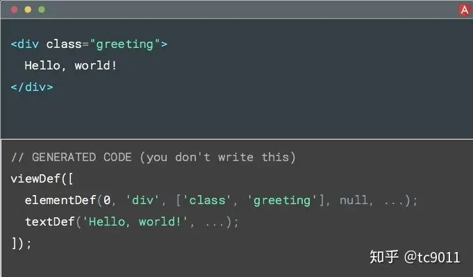 然后在运行时将此定义传递给 Angular 解释器,Angular 使用该def来确定要运行哪些操作以正确生成DOM。