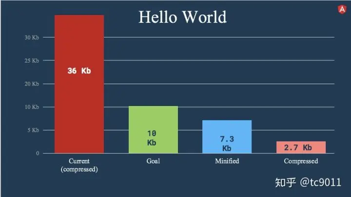 在当前的Angular中,压缩的Hello World大约为36 Kb,而Kara已经发现我们的hello world 最小化后 7.3kb,压缩后 2.7kb。 所以 Ivy 成功地击败了10KB的门槛。 我们不仅仅是刚刚跨过这个门槛,而是大幅度地超过这个门槛。