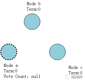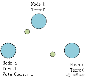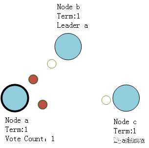 此时如果某个Follower节点,如Node a首先感知不到来自Leader节点发送的心跳,就会将自身的状态转换为Candidate。