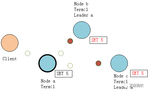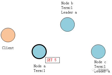 首先,客户端向Leader节点发送数据变化请求“SET 5”,Leader节点接收到这个改变后,会将其添加到节点的日志条目中。