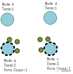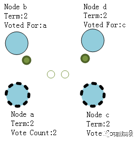 并且每一个都先于另外一个得到一个Follower节点的选票,但此时在这届任期类两个Candidate都将不会得到更多的选票了,那么在这一届的选择中就无法选出新的Leader节点了。