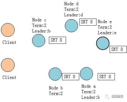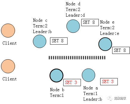 此时c、d、e三个节点组成集群选举产生了新的Leader节点e,并且选举任期更新为2,比节点b更高,同时两个Client分别向这两块集群发起了SET请求。由于节点b不能复制到大多数节点,所以一直处于Uncommit状态,而节点c因为能够复制到大多数节点所以可以正常commit。