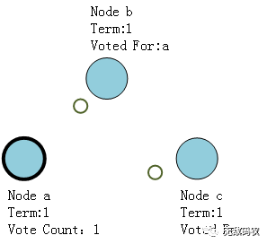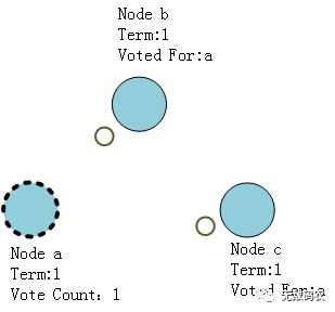 此时进入Candidate状态的节点首先会给自己投上一张选票(Voted For a)然后会向其他节点发送选举请求(Vote For me),要求选举自己为Leader。